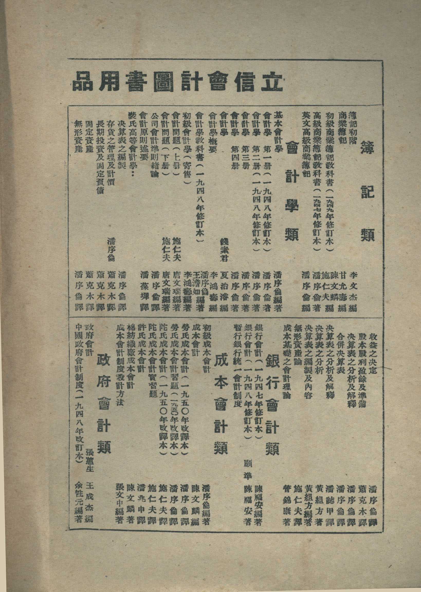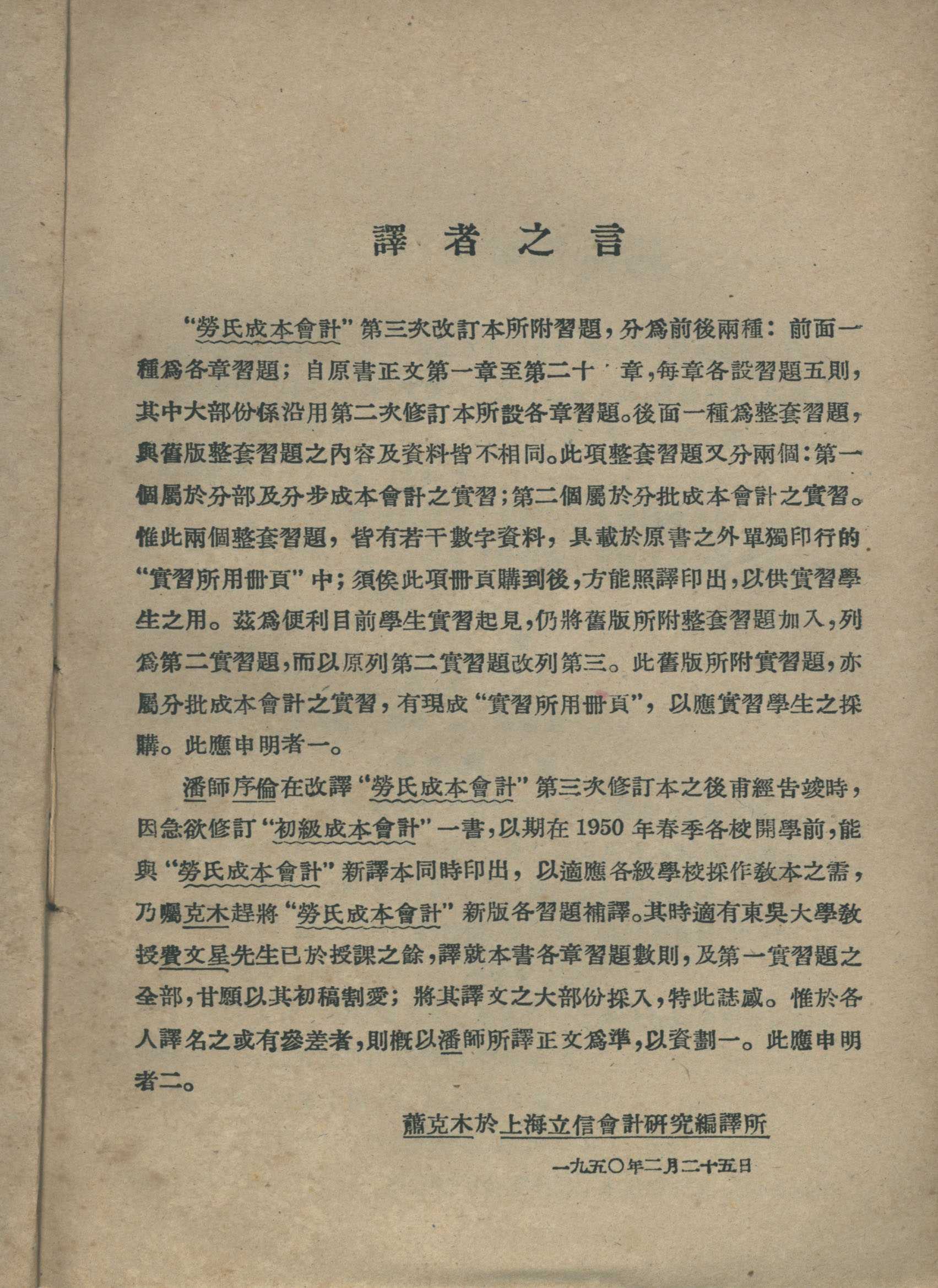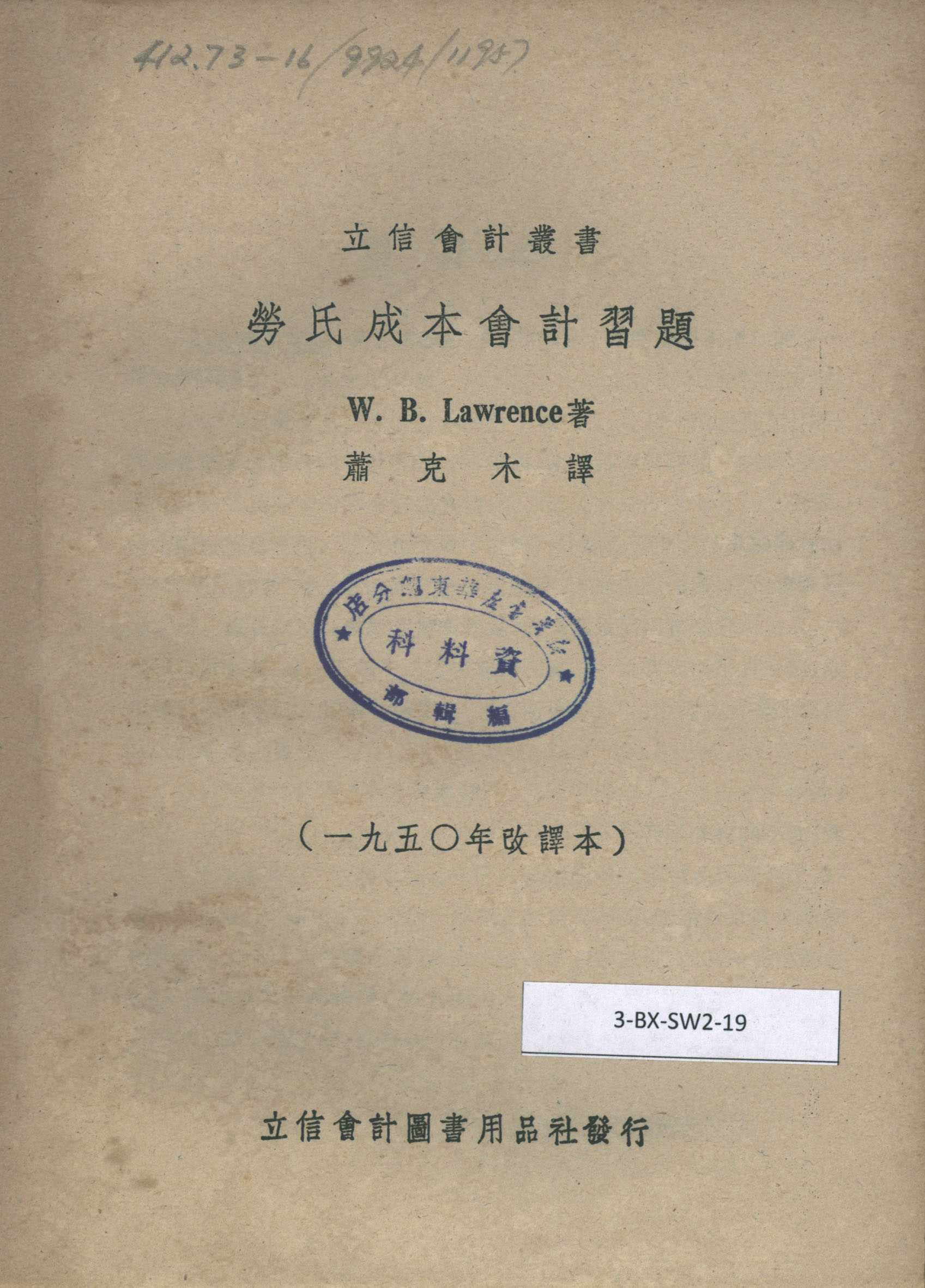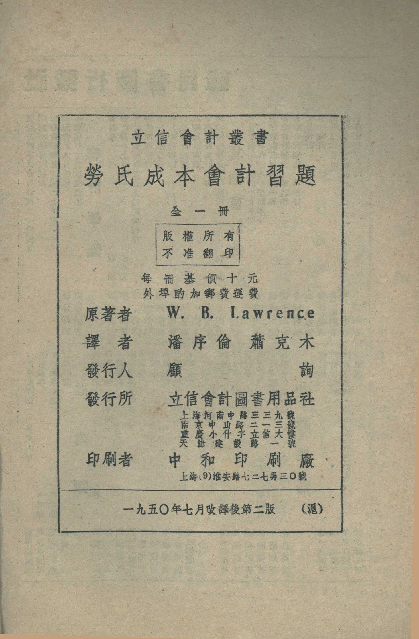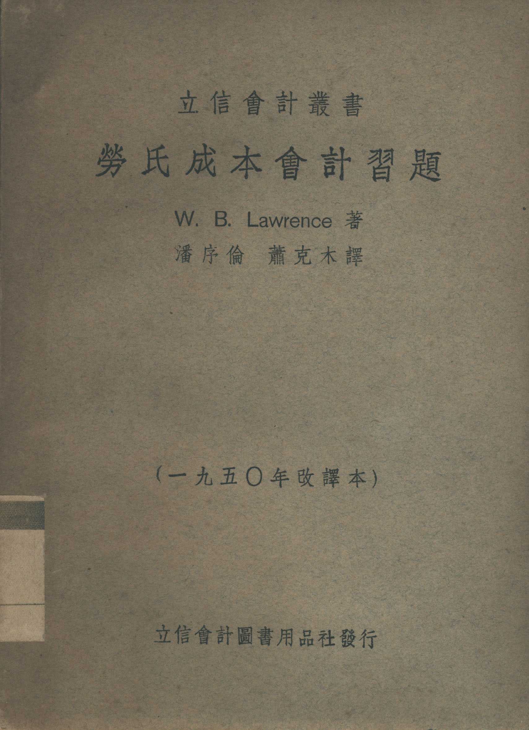 《劳氏成本会计习题》 W.B.Lawrence著 潘序伦 萧克木译 立信会计丛书 (1950年改译本) 立信会计图书用品社发行