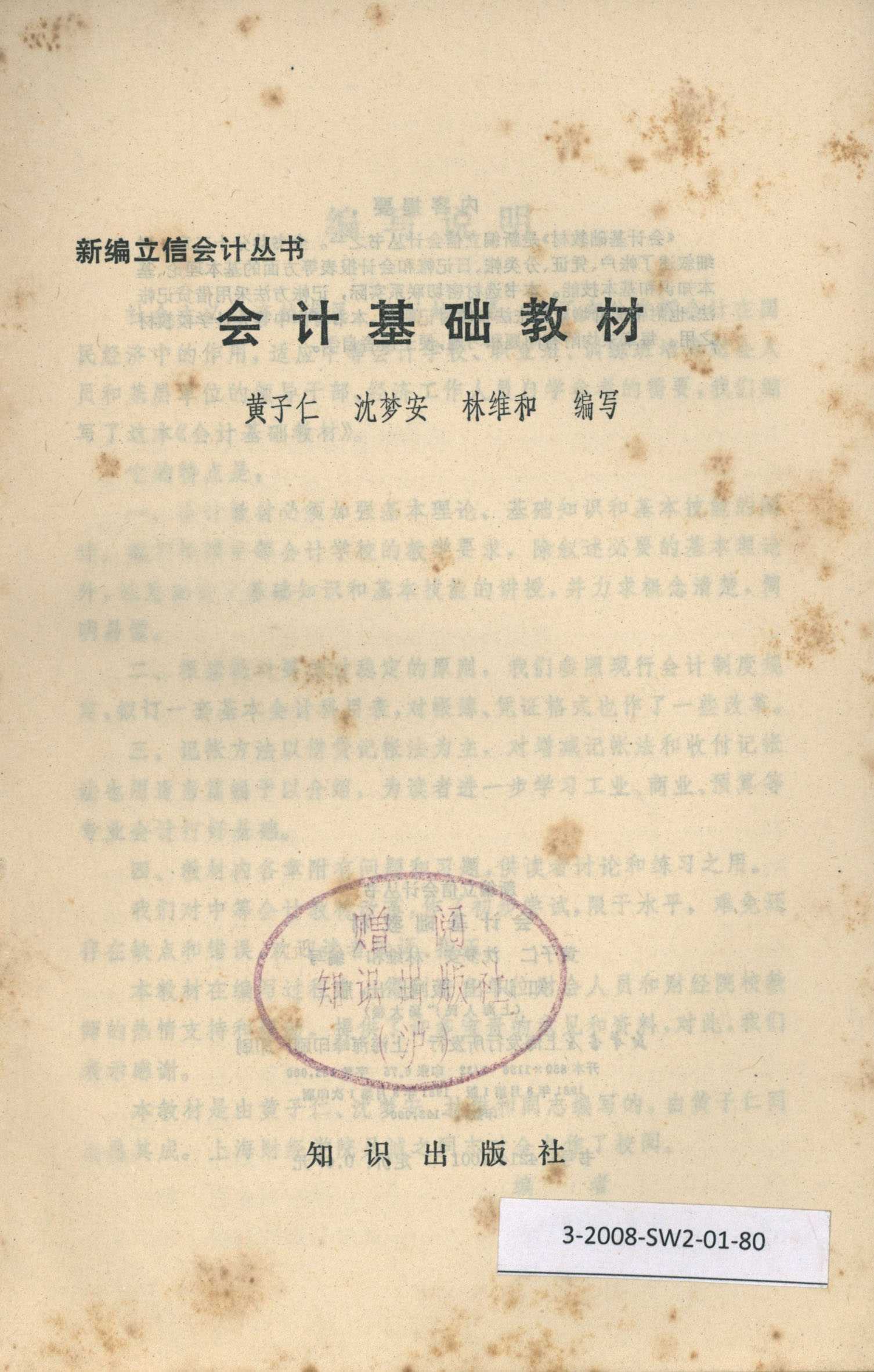 新编立信会计丛书 会计基础教材 知识出版社 黄子仁 沈梦安 林维和编写 主任潘序伦 副主任 王澹如 管锦康