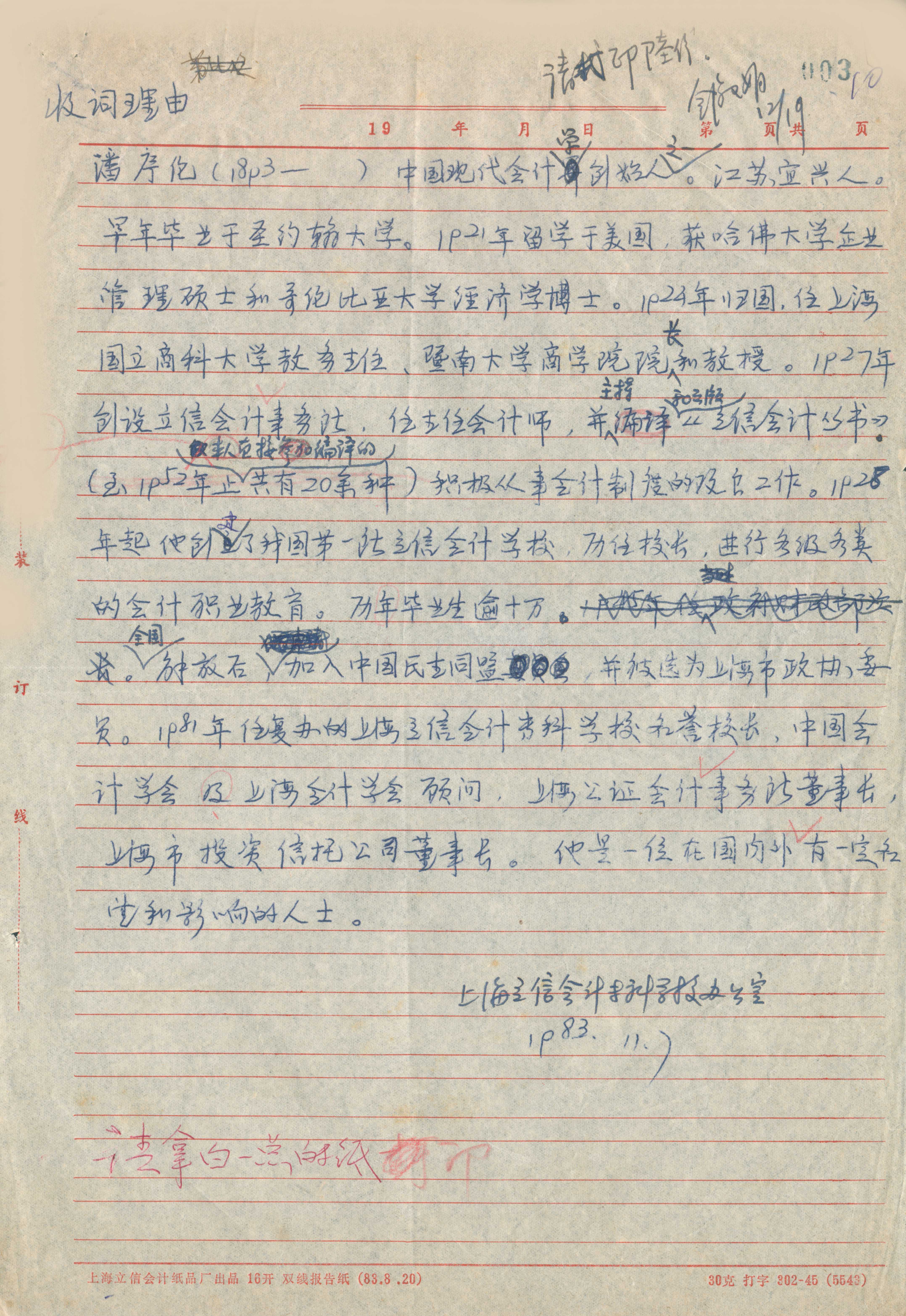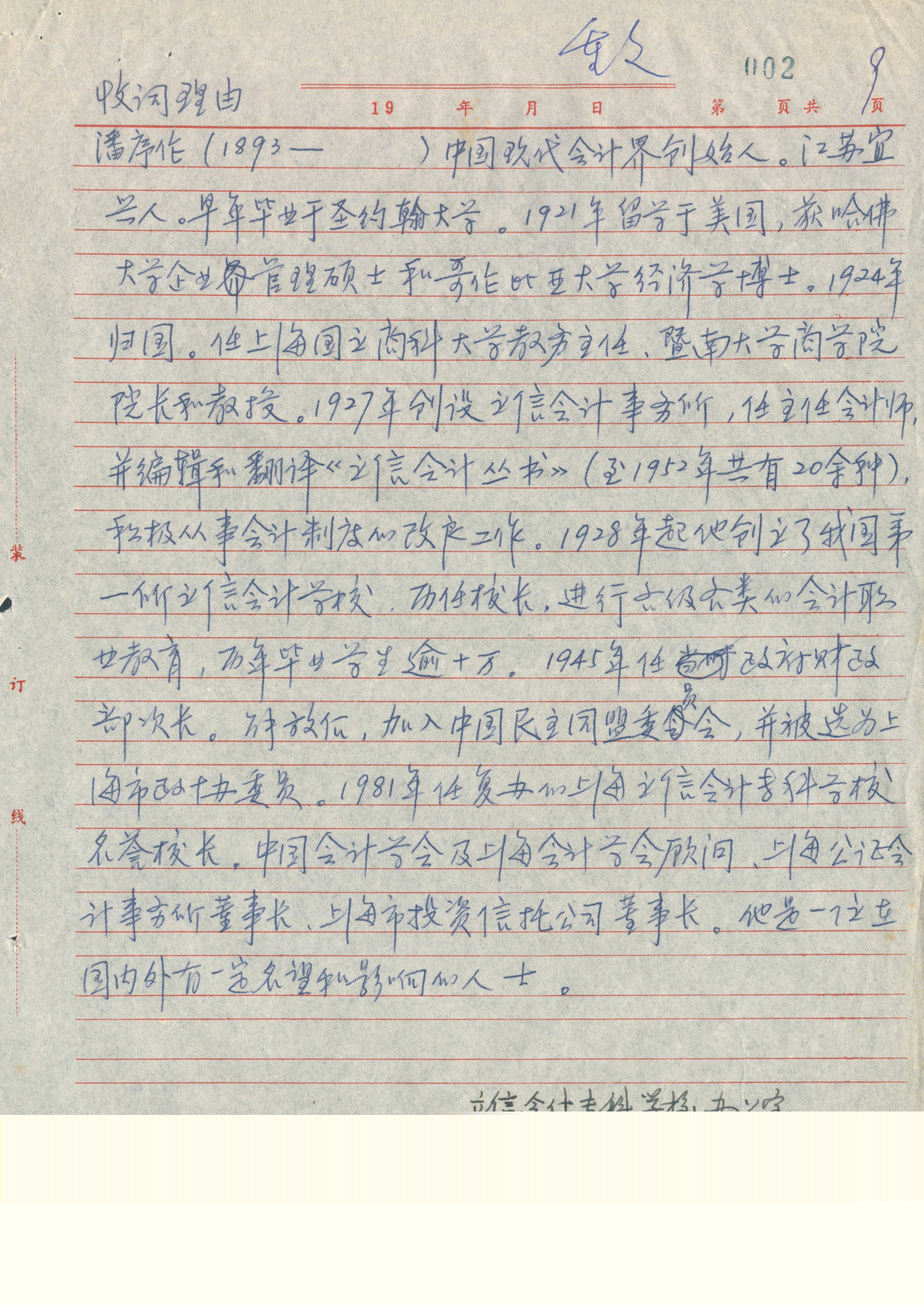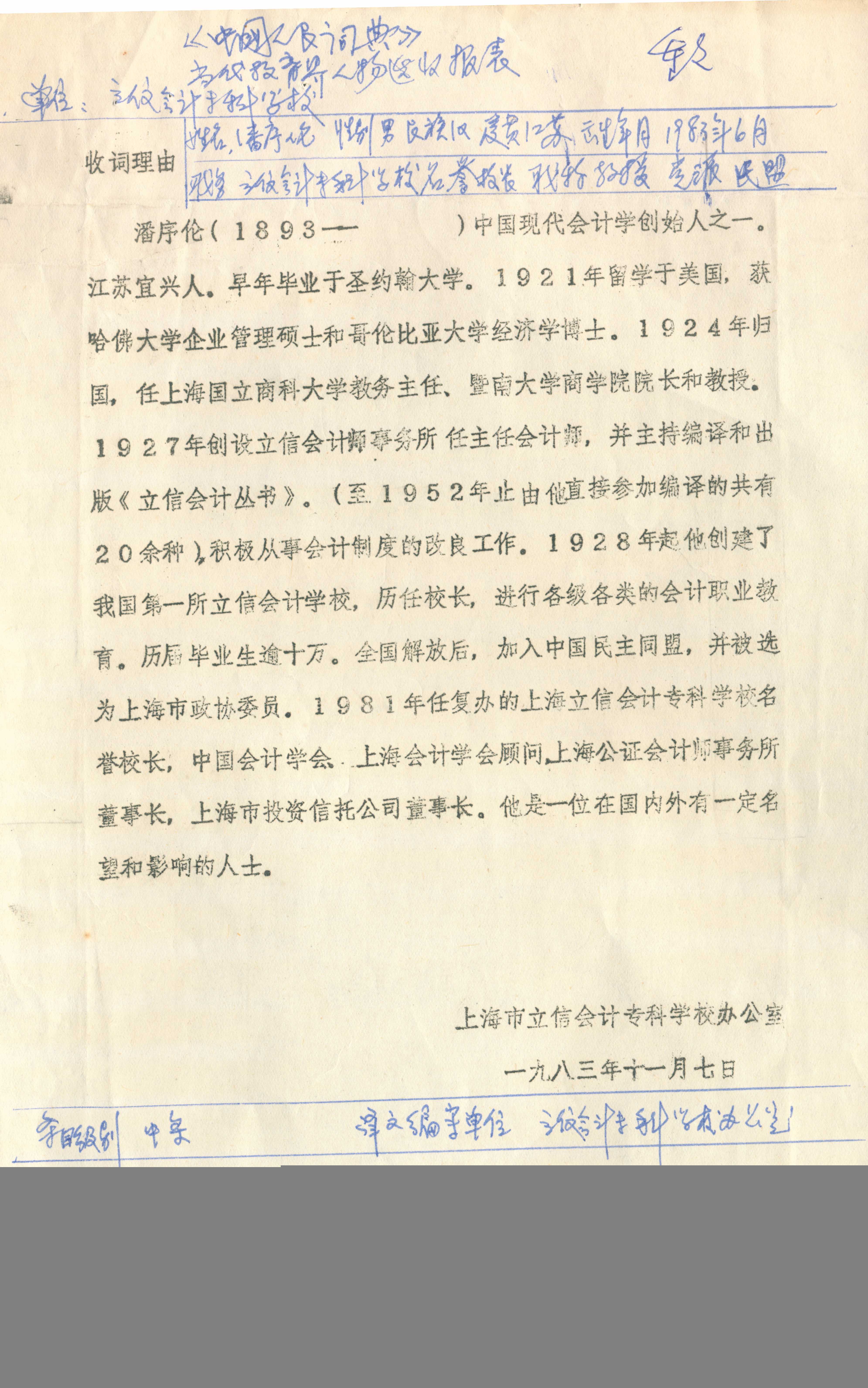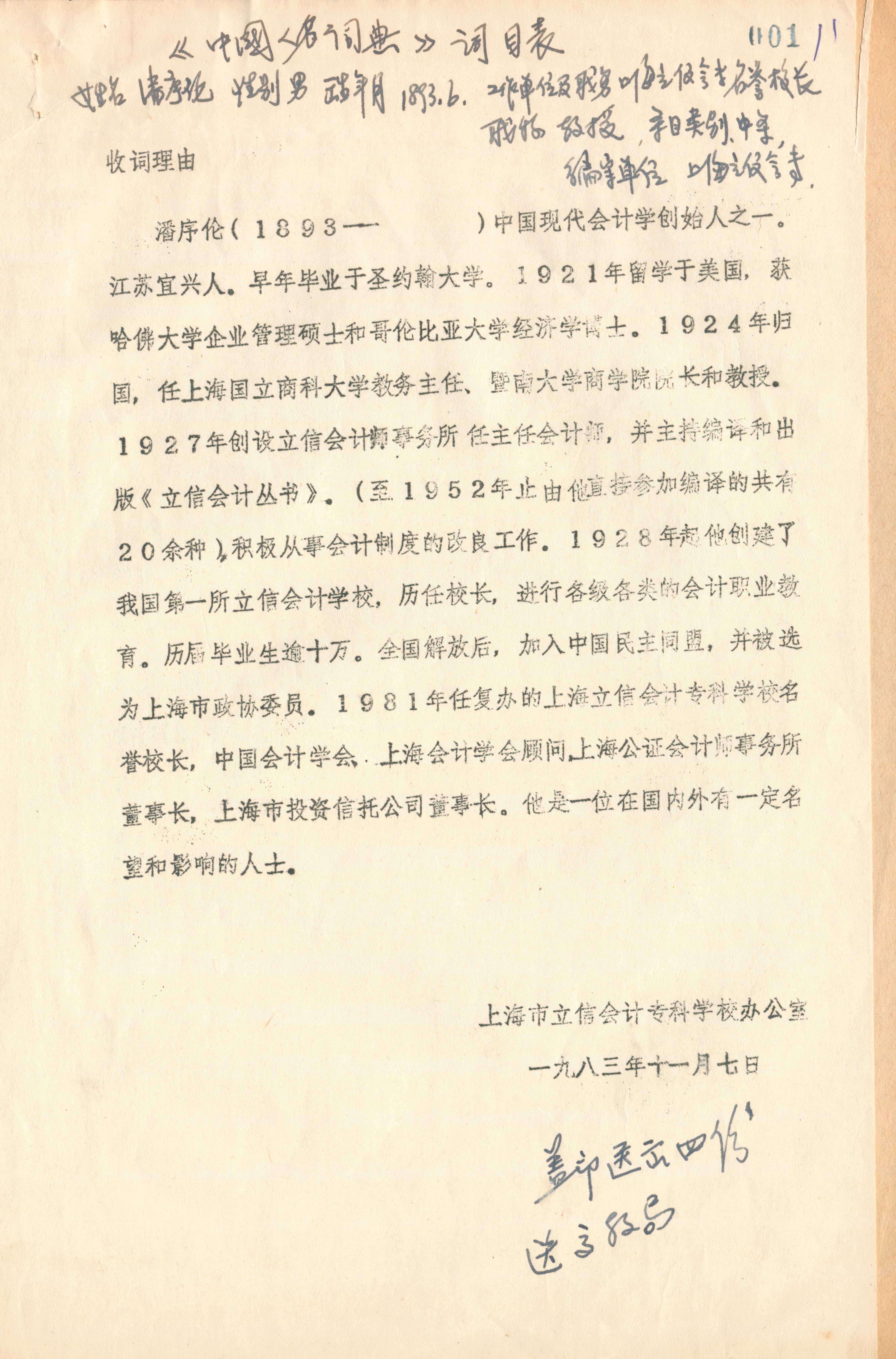 《中国人名词典》潘序伦词目表