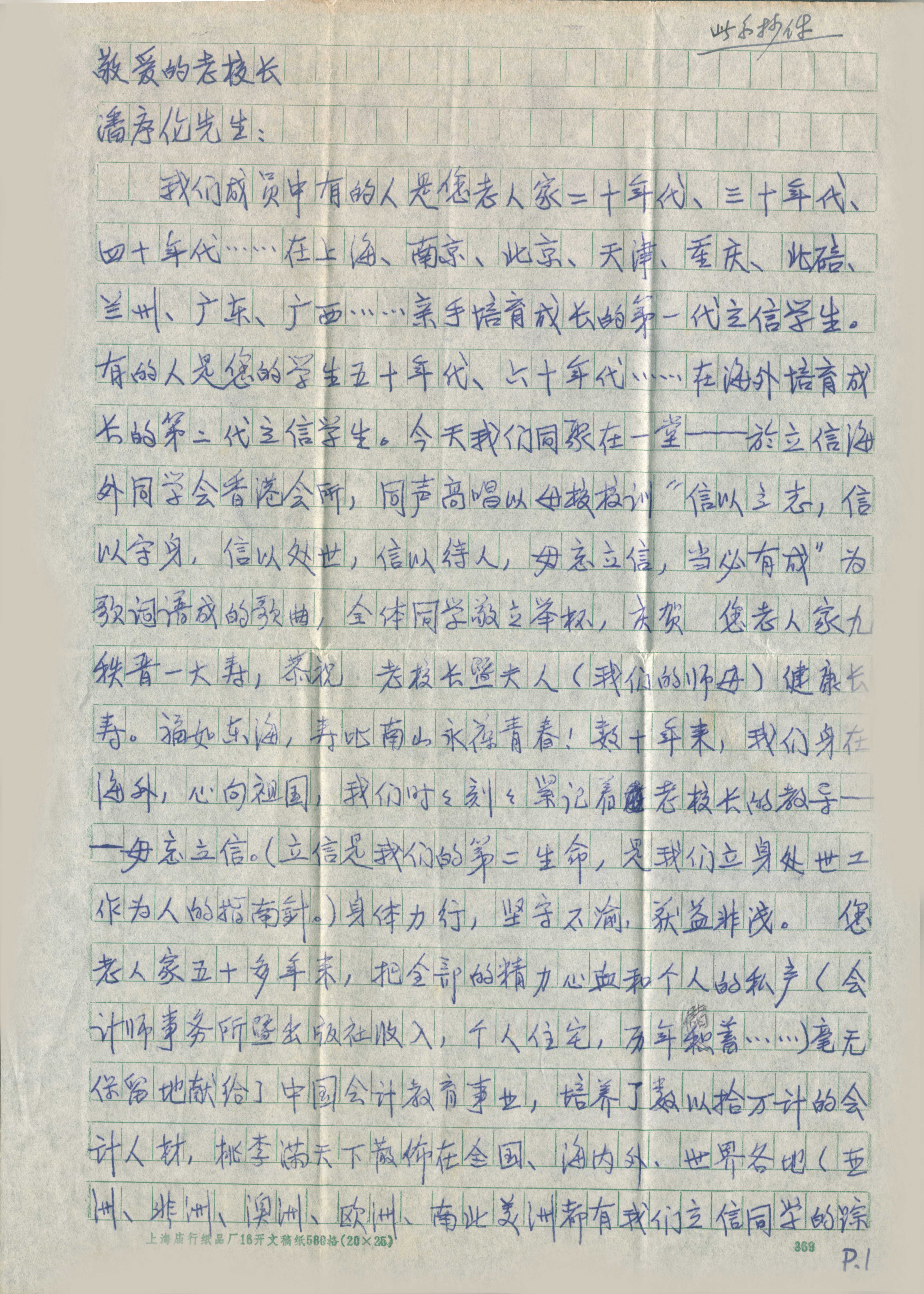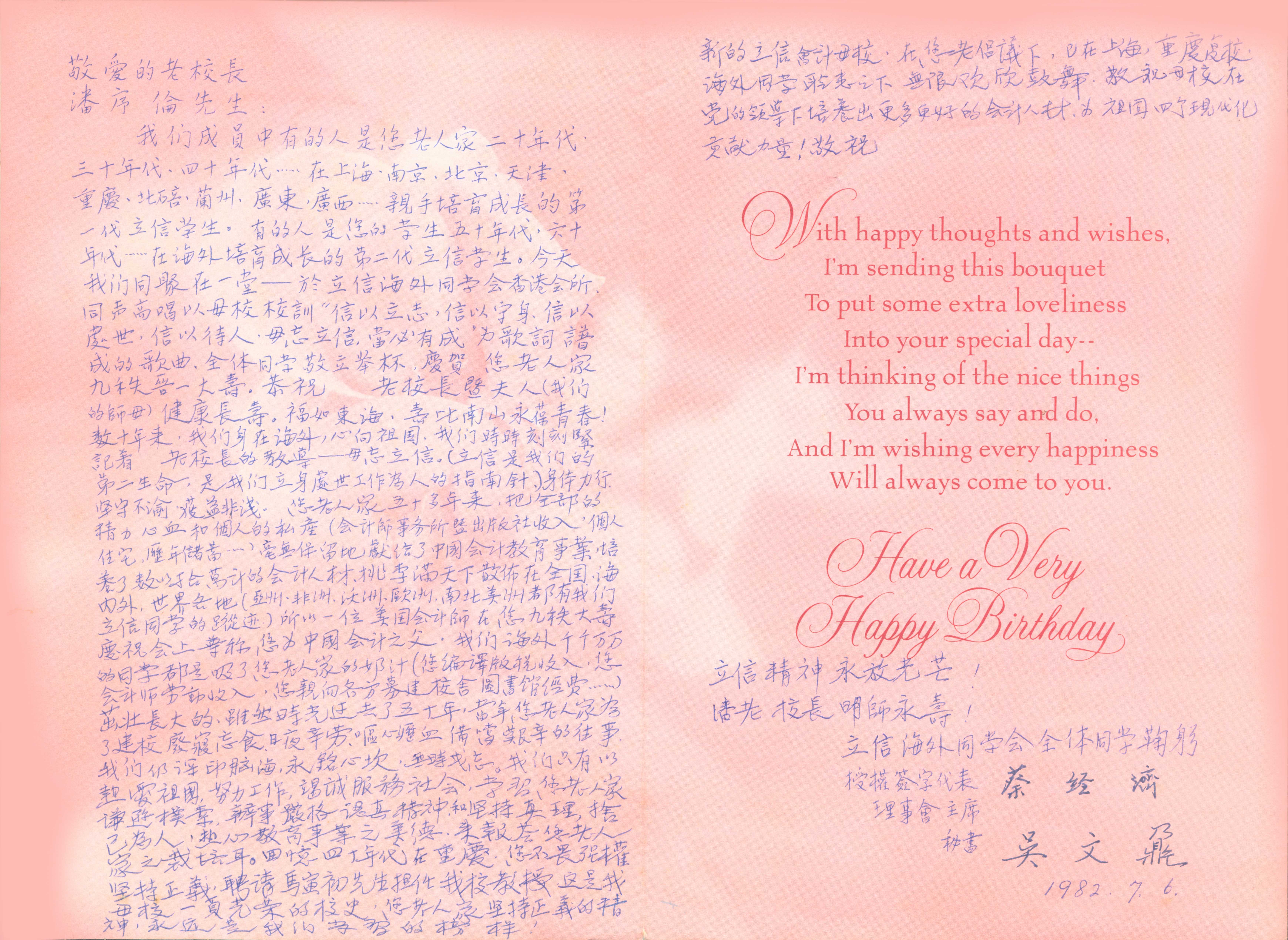 海外校友恭贺潘序伦先生九十二岁寿辰的信(立信会计海外校友会筹备组)