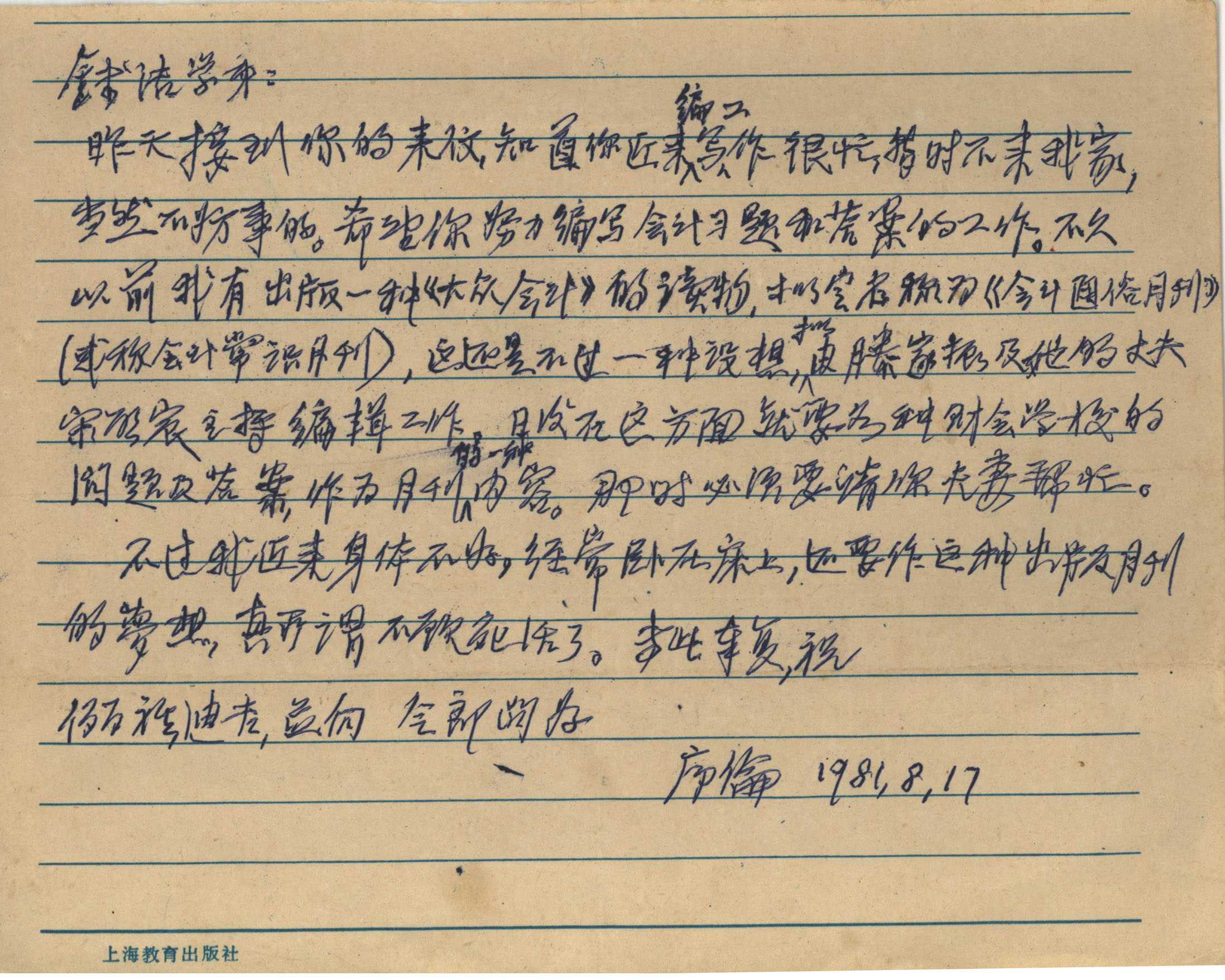 1981年8月17日潘序伦给钱洁的信原件1件(亲笔)