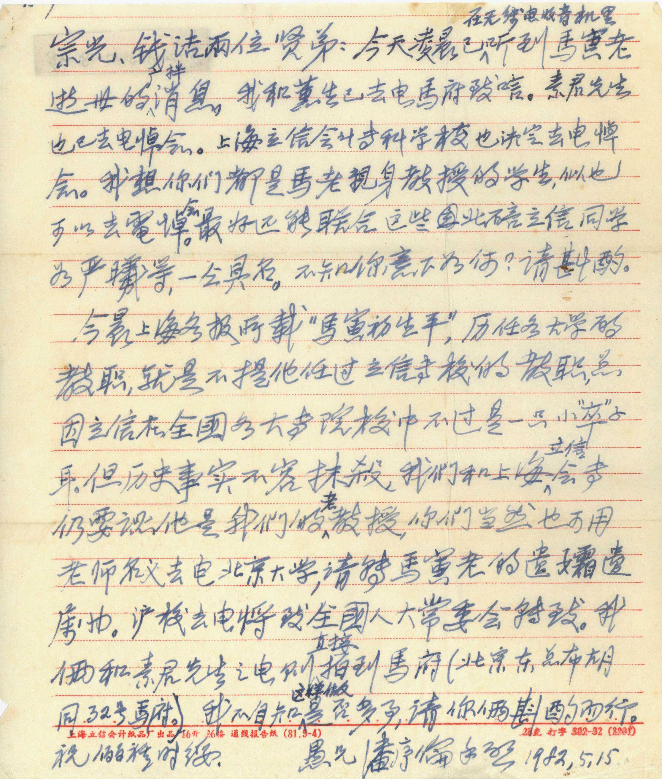 1982年5月15日潘序伦给李宗光 钱洁的信原件1件(亲笔)