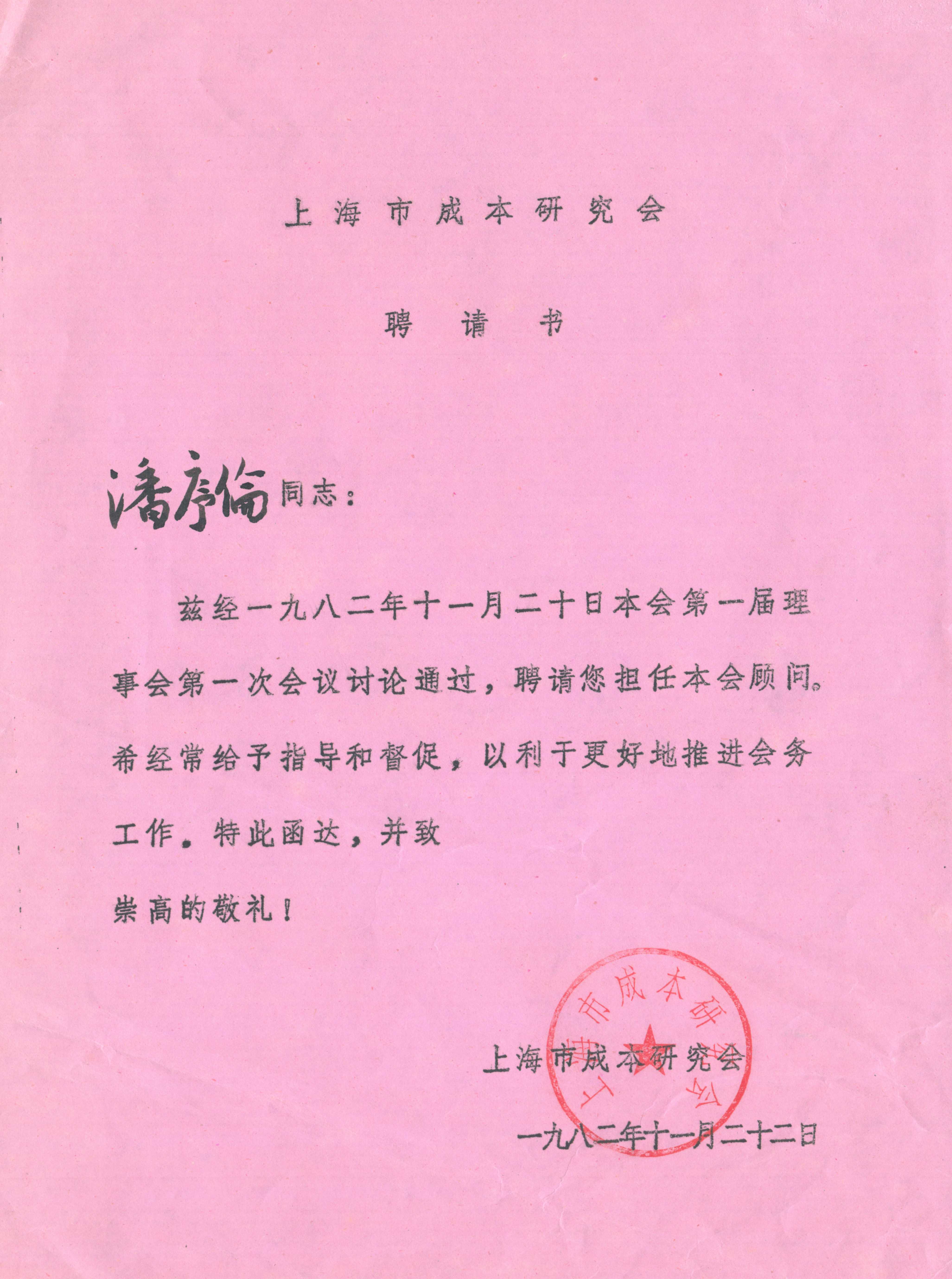 聘任潘序伦为上海市成本研究会顾问聘书(第一届)
