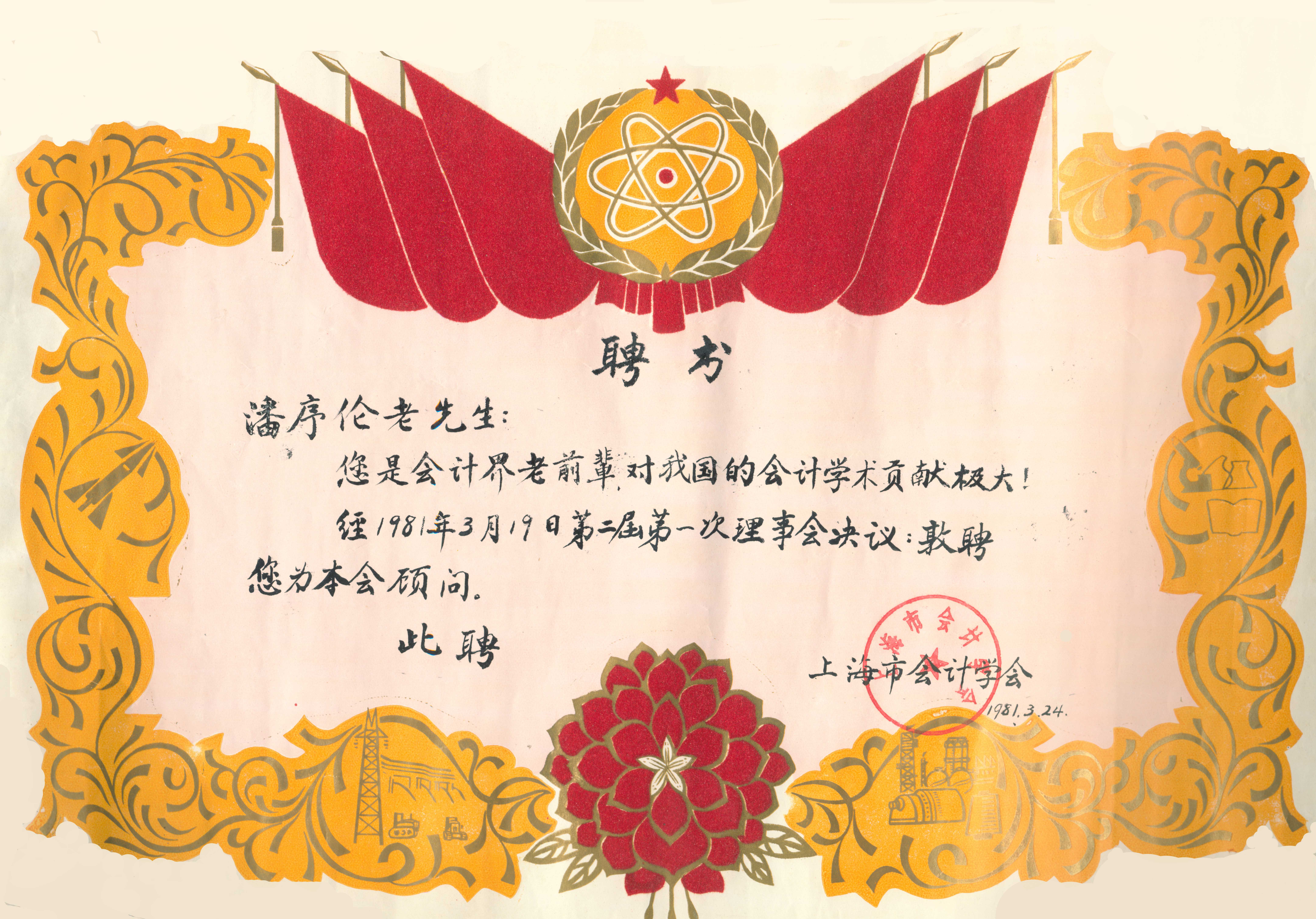 聘任潘序伦为上海市会计学会顾问聘书(第二届)